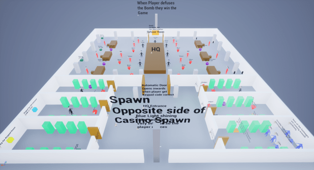 • Designing the game’s combat encounters, mapping out Enemy AI paths, creating sight lines, placing key items (keys, weapon pickups, traps etc.) in levels
